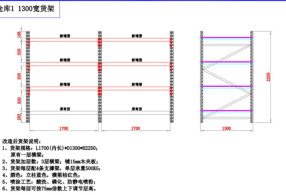 首先當(dāng)我們預(yù)留空間時,我們需要考慮很多因素。其中之一是貨架每層的高度。通常是根據(jù)貨物的高度來設(shè)計的。考慮到整個貨架的安全性,我們會根據(jù)貨物的高度留出更多的空間,這部分空間就是安全空間。因為如果儲物架的高度與貨物的高度相同,叉車將非常不方便取貨。它可能會與貨架碰撞和摩擦。如果你留出一定的空間,這個問題就可以解決.定制貨架尺寸為:長1700*寬1300*高2250 數(shù)量:4套 原有一層橫梁 2、貨架加層數(shù):3層 鋪15mm木夾板 貨架每層配4條支撐梁,單層承重500KG 每層可按75mm調(diào)節(jié)高度
