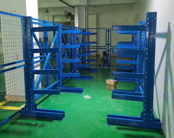 懸臂貨架的橫梁是一頭固定,另外一頭懸空,所以理論上不管多長(zhǎng)的物品都能放上懸臂架,際應(yīng)用中常用于管材、鋁材、以及板材。通常懸臂貨架都為人工上下貨物,也可配合側(cè)取堆高機(jī)上下貨物,正取也行,但通道需要非常大。這種款式貨架有單臂和雙臂之分,專(zhuān)用立柱型材,設(shè)計(jì)背拉增強(qiáng)穩(wěn)固性,高強(qiáng)度懸臂,每臂可承重2000KG以上,高度可在100mm以?xún)?nèi)上下調(diào)節(jié)。以下是我公司根據(jù)場(chǎng)地實(shí)際情況為客戶(hù)定做的倉(cāng)庫(kù)貨架如圖:
